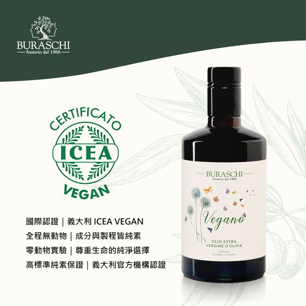 義大利首支獲得「ICEA」VEGAN純素食產品認證冷壓初榨橄欖油